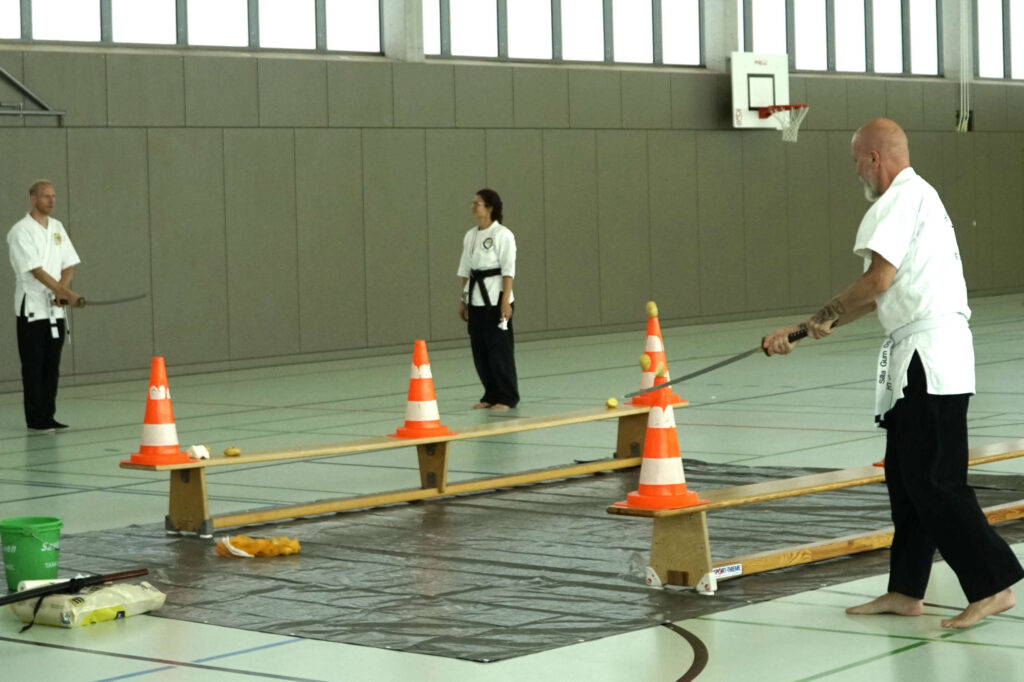 Zum Abschluss des Lehrgang wurde mit scharfen Schwertern geschnitten. Franz-Josef Wolf wies in seiner Einführung zu den Schnittesten darauf hin, das ein Schwert keinerlei Fehler verzeiht, also mit größtmöglicher Sorgfalt im Umgang damit zu verfahren sei.
